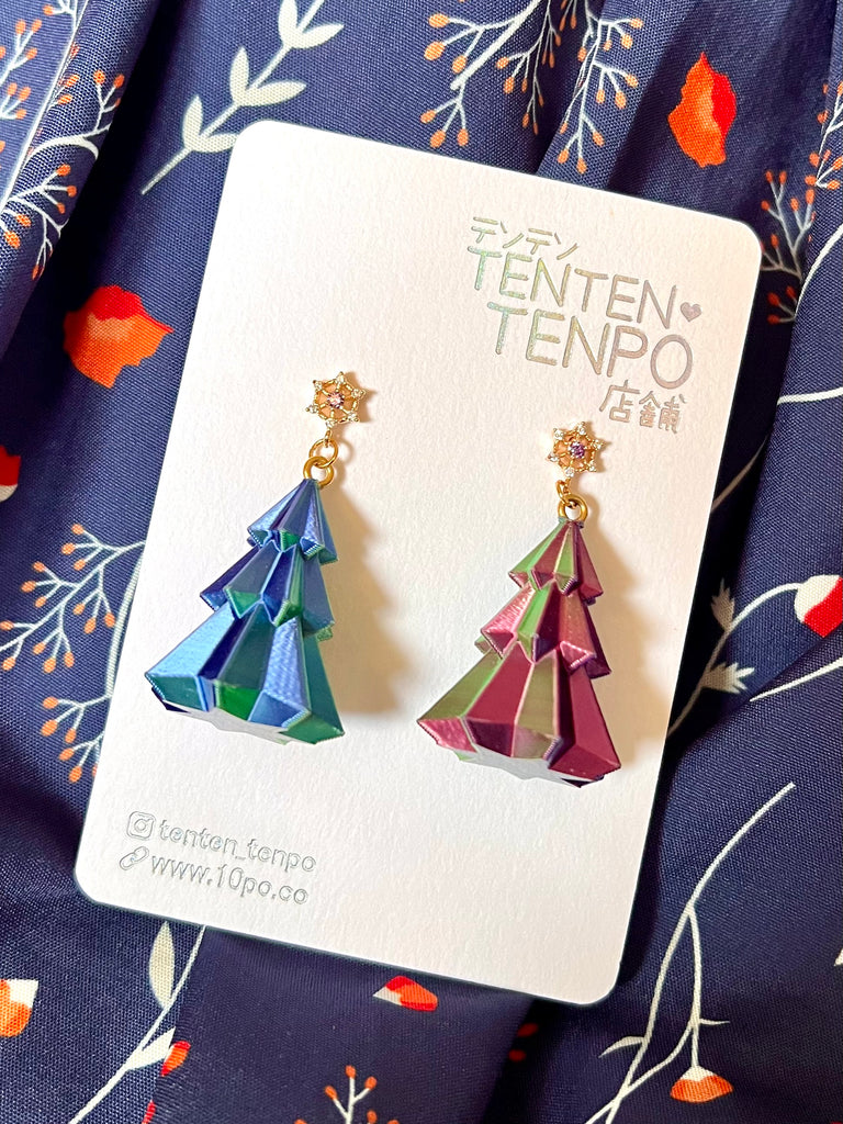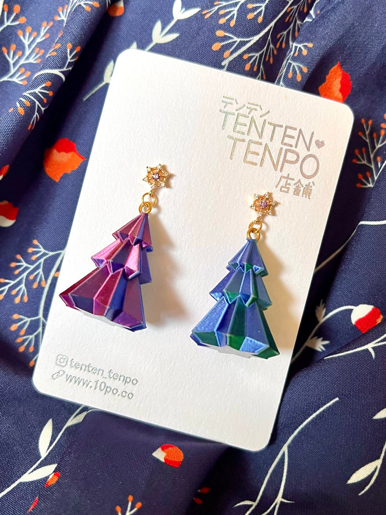 Colour-shifting 3D printed Christmas tree!  Both images are the same pair of earrings from different angles.
